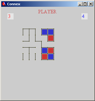 I don’t know if this game has a commonly used name. It was invented (or reinvented) by me and a friend under the name Connex. The rules of the game are simple. Players take turns at drawing a line between two dots on a regular grid. If a line makes an area water-tight, the area belongs to the player that drew the line. The game ends when all areas have been claimed, and the winner is the player with the largest combined area. Our AI is reasonably hard to beat, but can be tricked in some situations by an experienced player. The AI was implemented in Lisp and uses a simple graphics library for the user interface.