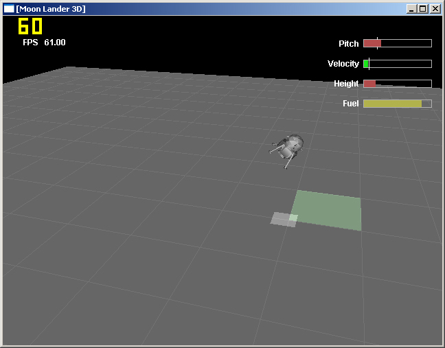 User input controls the moon lander’s five thrusters, visualized by simple particle systems. An inertial system determines rotation and translation of the lander. The moon lander was modeled in 3DS MAX. The main remaining problem here is how to divide thrustor forces between rotation and translation, or to be precise, how to determine the ratio between translation and rotation given a force at a certain point having with a known centre of mass. This factor has been estimated to “feel” good. The simulation was turned into a game, where the user tries to land at a given location within fuel constraints, which is more difficult than it might seem.