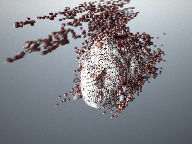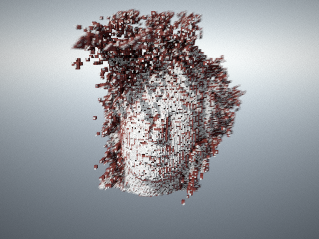 Famous rockband Radiohead have generously released the data captured during the making of the video for their single House of Cards. The data consists of several thousand frames of real-time laser scan data of singer Thom Yorke’s face. A few frames are showed on the left. Two levels of voxelization, rendered in different colors, are overlaid and rendered with depth-of-field and motion blur. Finally, the images were post-processed to remove some saturation from the green and blue channels.